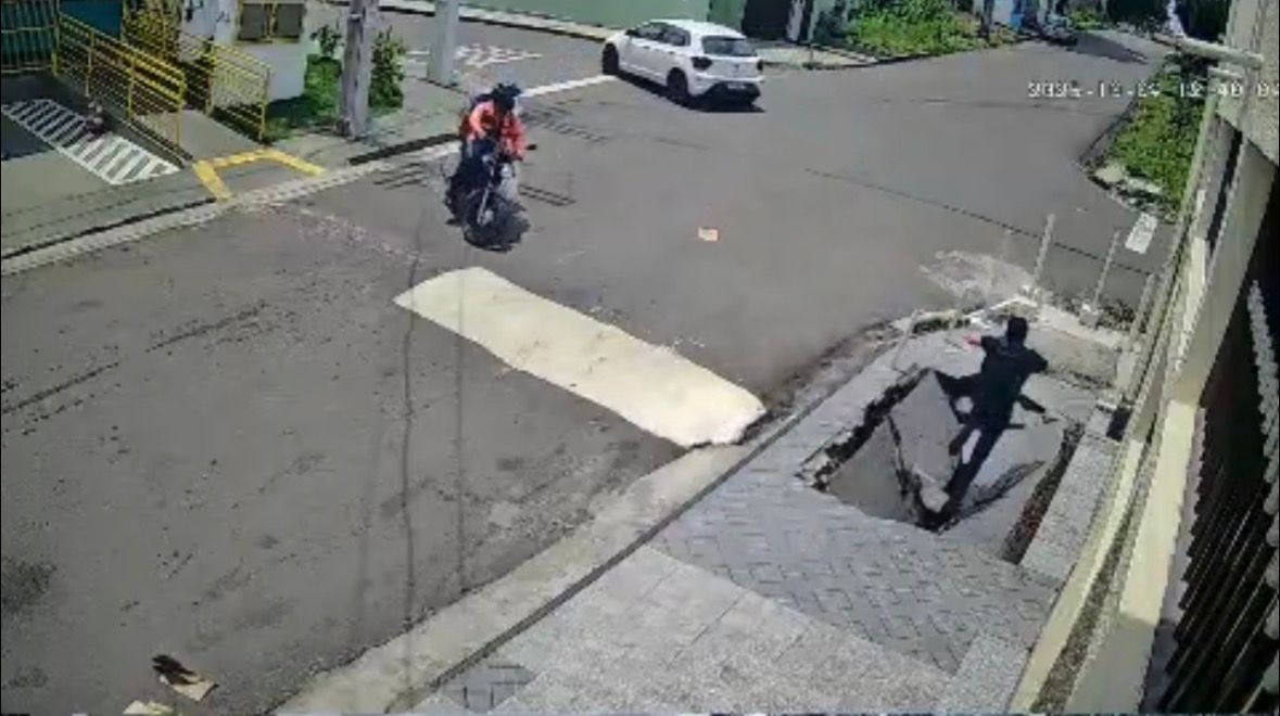 Nessa quinta-feira (08), um estudante caiu em um buraco que se abriu em uma calçada na rua Paraguaçu, no bairro Vila da Prata, zona Oeste