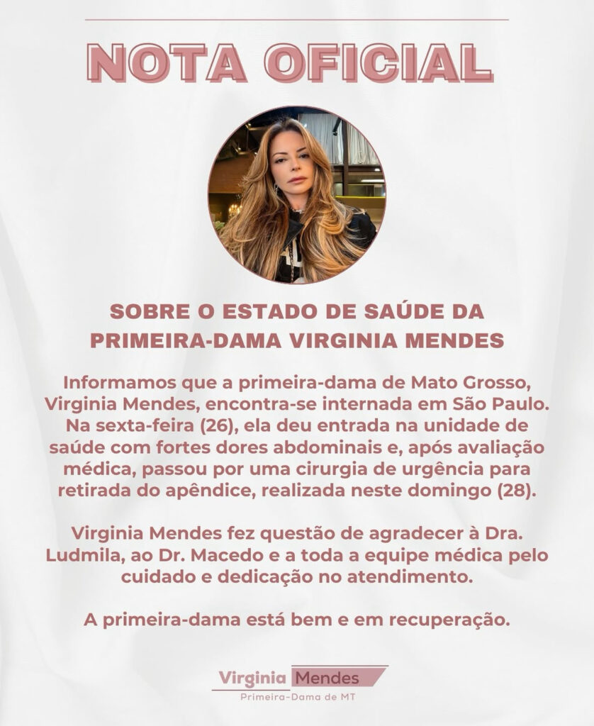 Informamos que a primeira-dama de Mato Grosso, Virginia Mendes, encontra-se internada em São Paulo.